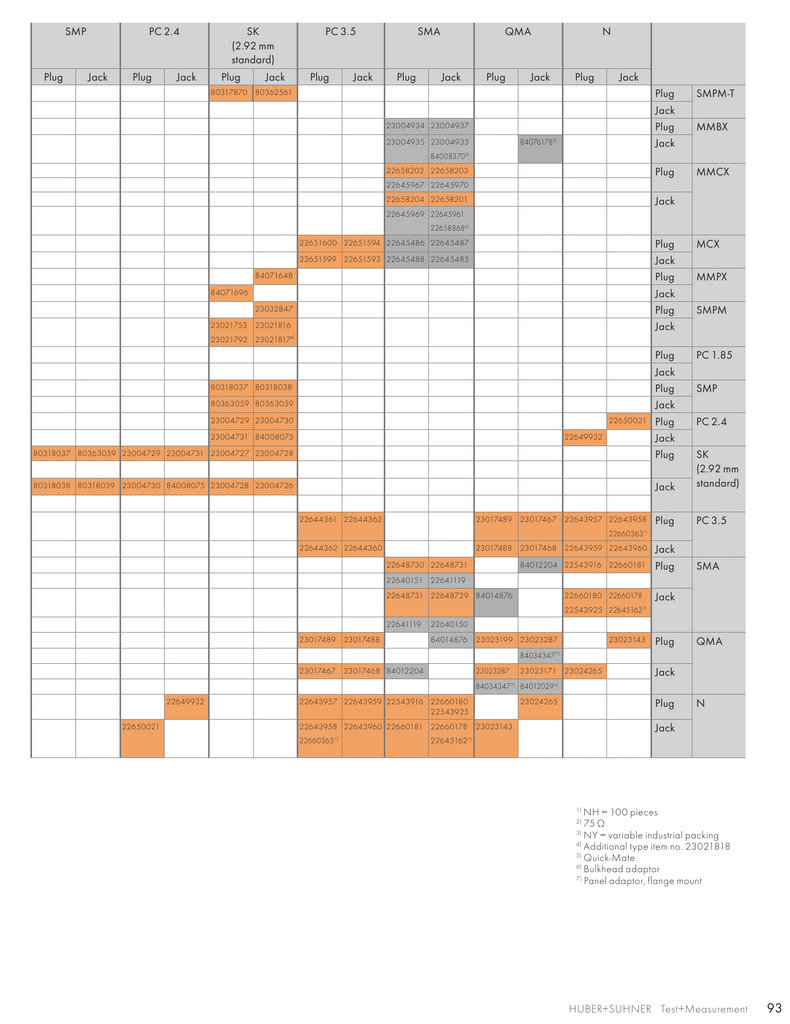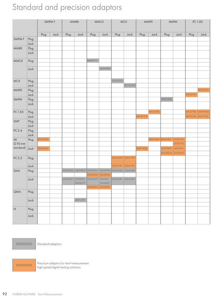 HUBER+SUHNER is manufacturing a wide range of adaptors in various configurations such as within series or between series,straight or angled designs, and some with panel mount features. They are classified according to their typical intended applica-tions, each of which requiring specific properties. There are four major groups: standard, precision, low passive intermodulation(PIM), and quick-mate adaptors.
